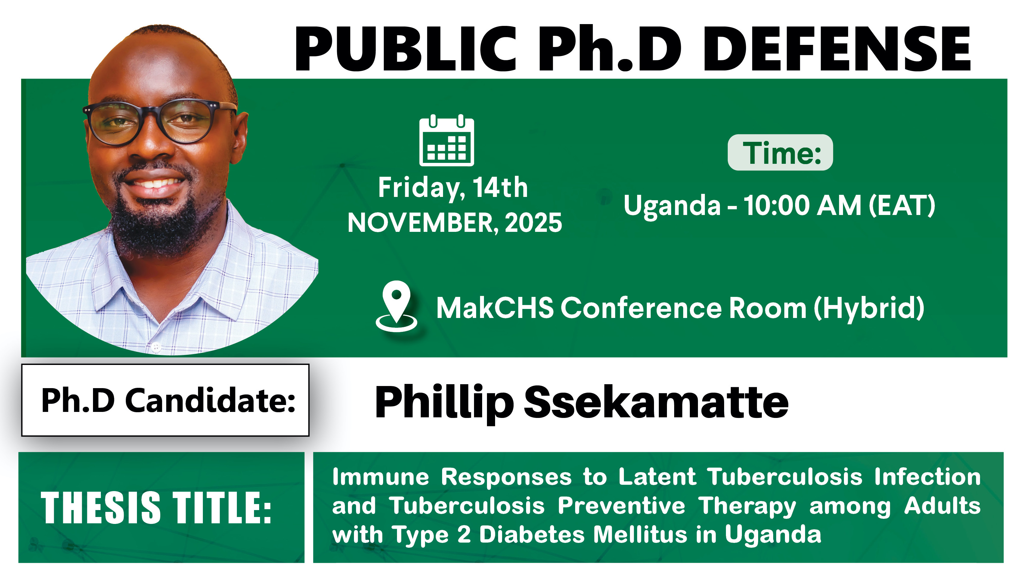 The Dean, School of Biomedical Sciences, Makerere University College of Health Sciences, invites you to be part of Phillip Ssekamatte's Public PhD Defense, scheduled for Friday, 14th November 2025, at 10:00 AM (EAT). See details below: