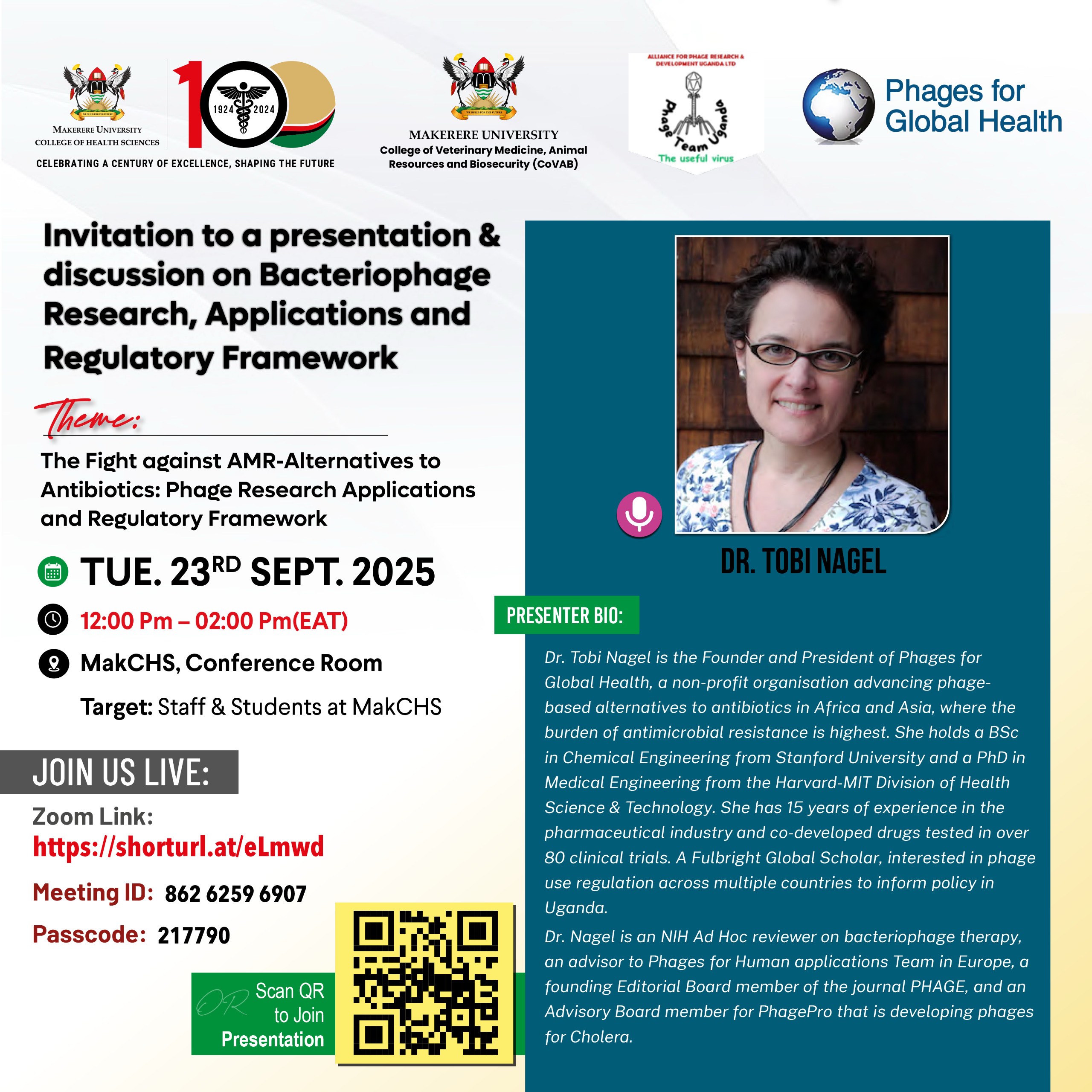 Dr. Tobi Nagel, Founder and President of Phages for Global Health and Fulbright Global Scholar, will share her extensive experience advancing phage-based alternatives to antibiotics in Africa and Asia. Dr. Nagel has co-developed drugs tested in over 80 clinical trials and advises multiple international initiatives on bacteriophage therapy and policy.