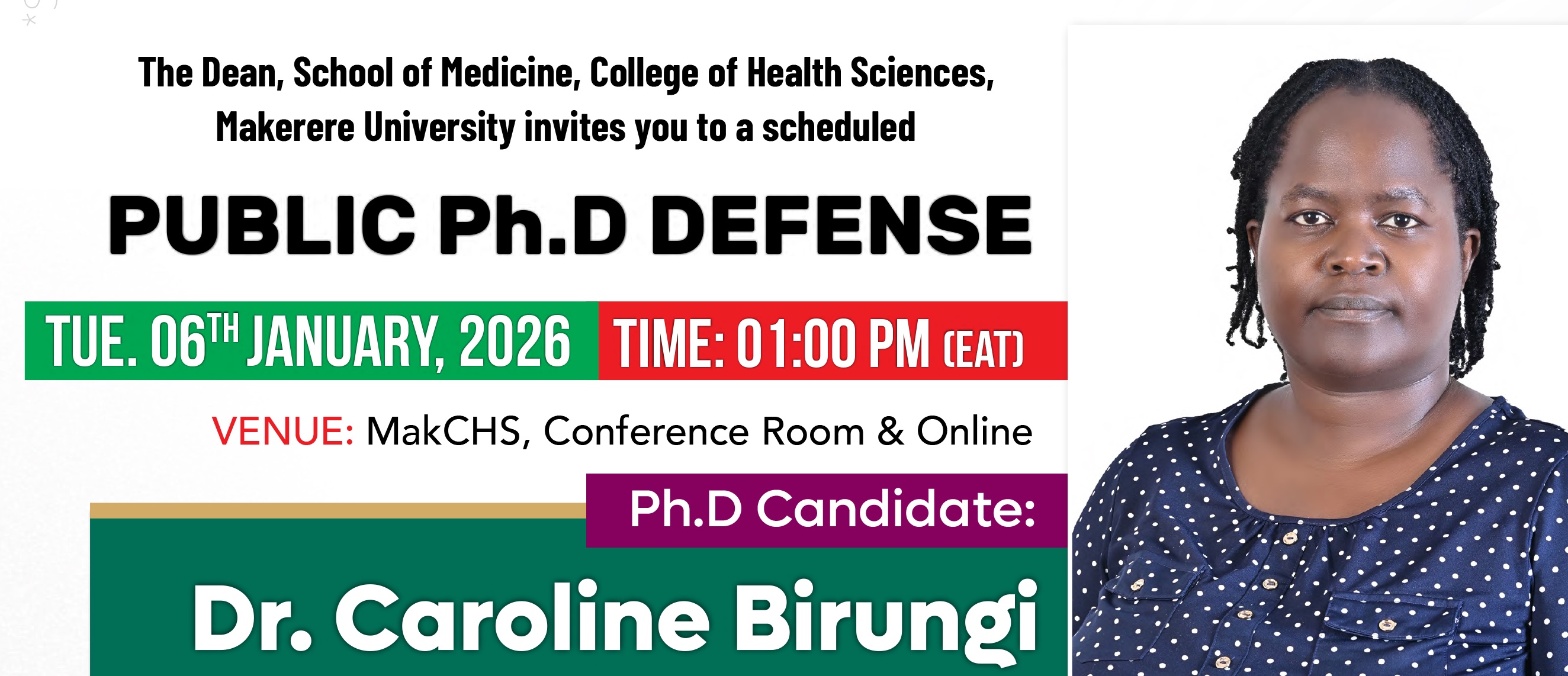 The Dean of the School of Medicine, Makerere University College of Health Sciences, requests that you save the date of Tuesday, 06th January 2026, for Dr. Caroline Birungi's PhD defense. See details below: